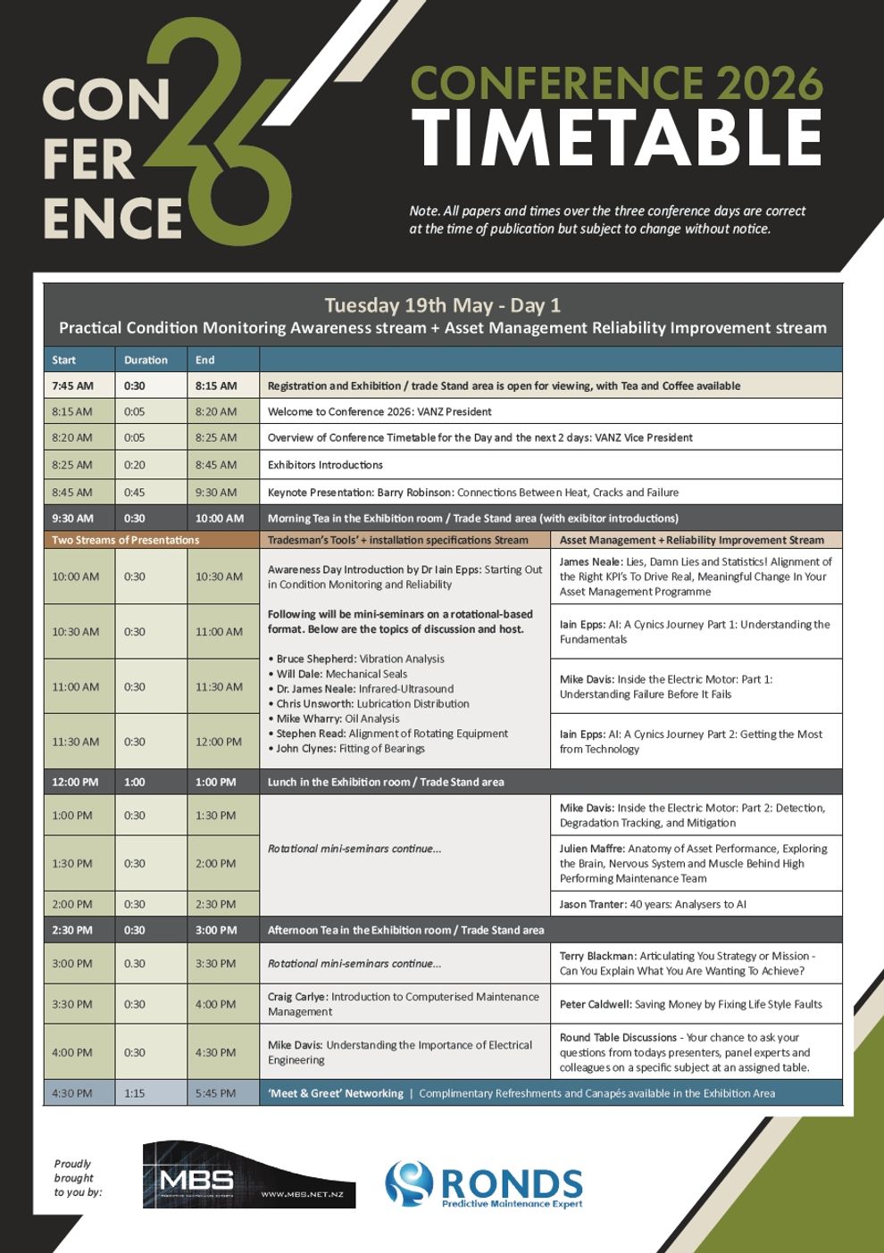 “40 years: Analysers to AI” (30 minutes) and “Three things every vibration analyst should know” (45 minutes)
